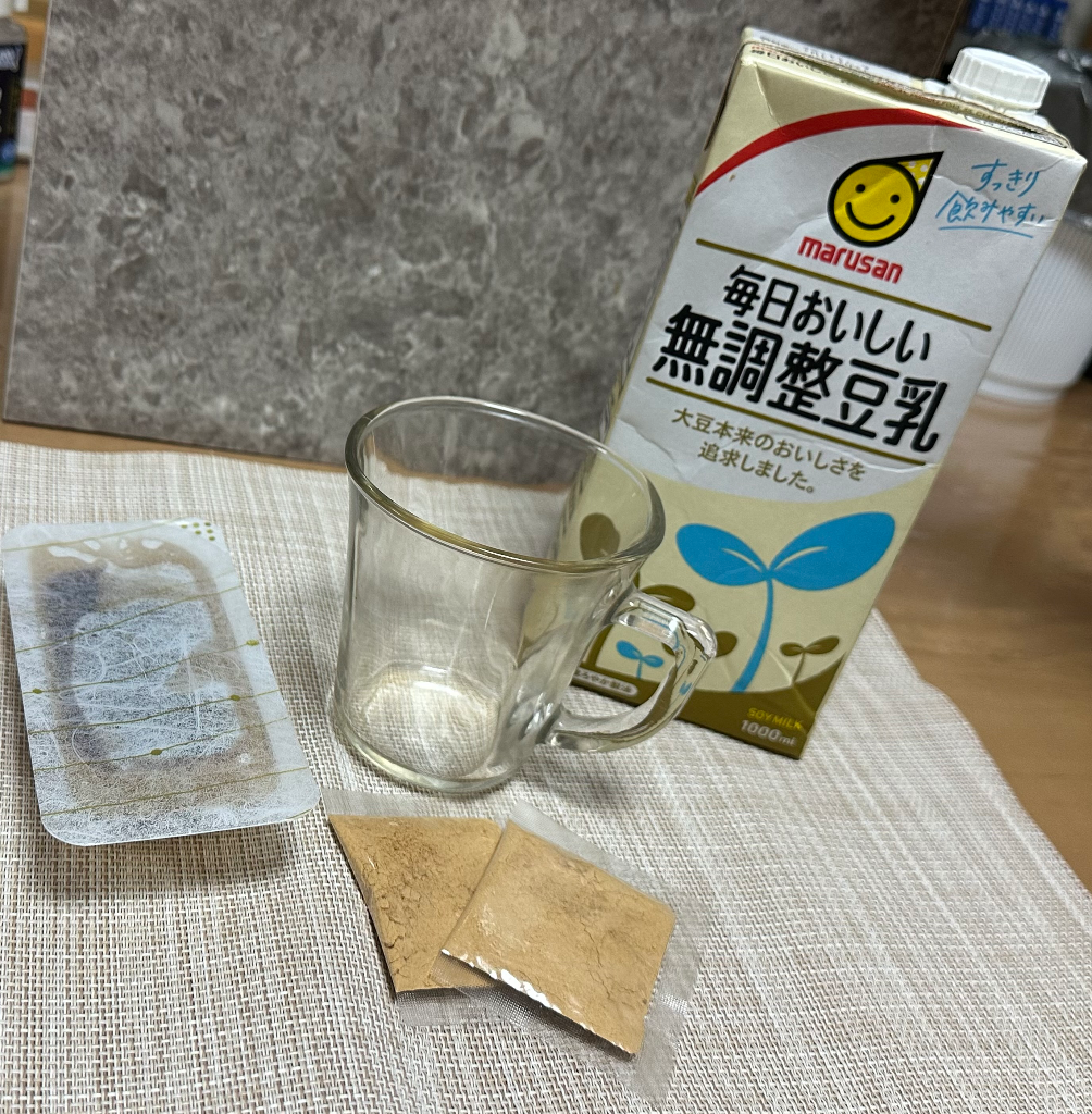 ①豆乳、黒糖生わらび餅、きな粉、氷を用意します